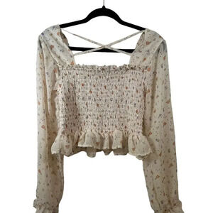 Chance and Fate Smocked Cropped Sheer Sleeved Blouse with floral pattern size XL. Criss Cross on the upper back. Beautiful and dainty for the upcoming spring. No stains or holes.