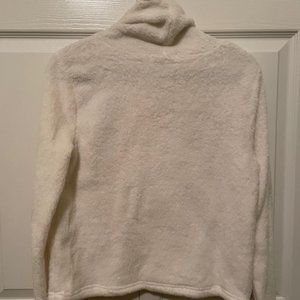 The cream colored soft fuzzy sweater is perfect for Christmas. It has a cowl neck so it is not too tight. The fabric is soft and cozy. Long sleeved, with a snowman face in sequins on the front. The size is medium but it fits more like a small.