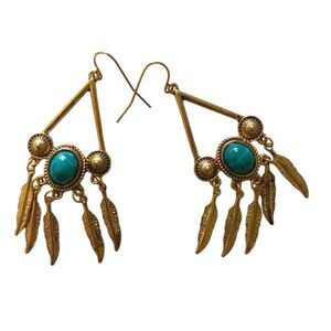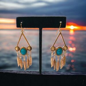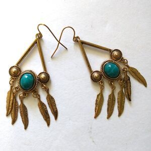Chandelier Feather Earrings Faux Turquoise Gold Tone Western Aztec Southwestern.