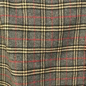 Chandler Hill women's wool blend plaid skirt. Feature dark gray background with black, cream, and red plaid design over all. Pretty frayed faux wrap look. Zip back with button waist closure. Fully lined. Waist measure 16 inches side to side laying flat. Length is 37 1/2 inches from waist to hemline. Nice piece to add to your fall and winter wardrobe. Good for business or dressy wear. Size 12. Twelve.