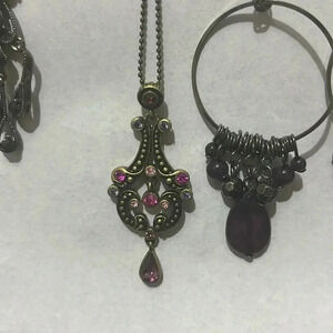 These are gothic style. Black chandler earrings, hook style. The other is deep purple beaded earrings, hook style. Necklaces is an antique look to it with dark pink, light pink and purple rhinestone stones. The pendant measures 2” and the chain is 16” with a 2” extender. Thank you for looking. Costume jewelry.