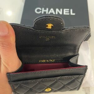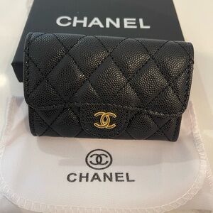 Chanel wallet in black quilted leather. Features iconic gold logo. Stylish and functional.