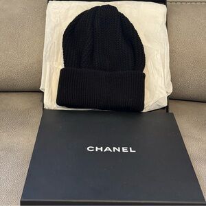 Crafted with high-quality cashmere material, this beanie is perfect for the fall, winter, and spring seasons. The solid black color and metal theme make it a versatile accessory that can be paired with any outfit. Don't miss out on the chance to own this beautiful Chanel beanie that is perfect for any fashion-forward woman.