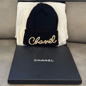 Elevate your winter look with this stunning black cashmere beanie by Chanel. The hat is adorned with gold script and sequin accents, featuring the iconic Chanel logo. This one size fits all beanie is perfect for any occasion, whether you're headed to a party or just running errands.