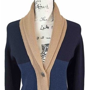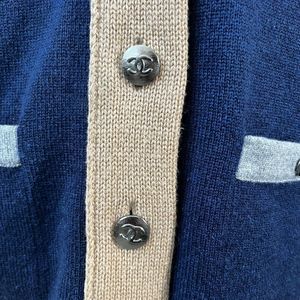 Chanel 100% Cashmere Cardigan Sweater Color Block Size 40 Blue Tan Gray Buttons