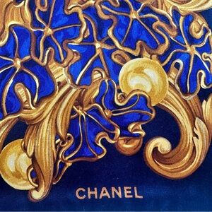 Elegant Chanel scarf featuring a midnight blue color way with gold floral design. Perfect for adding a touch of luxury to any outfit.