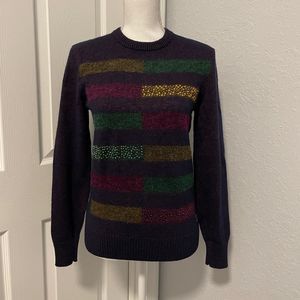 Fabulous Chanel 2012 Fall Ready to Wear Runway Collection crystal & metallic multi color shimmery pullover sweater. Unworn with original retail tags. Beautiful, vibrant piece in a rich color palette of: indigo purple, pink, green & gold. Very shimmery sweater with iridescent metallic thread throughout & large crystals forming an elegant color block pattern. A large CC logo made of aurora borealis crystals, adorns the bottom right of the sweater. The CC logo flashes pearl pink tones. A magical & ethereal piece crafted of soft wool & a mohair blend. Retail $1,920.00. Size 36, fits like a small, with comfortable stretch.