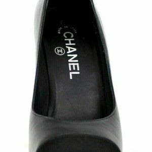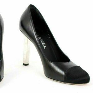 DESCRIPTION These high-heel pumps by Chanel have a round toe design and they feature a square ruler heel and the iconic CC logo on the outer side upper heel. Composed of black leather with a black satin cap toe, lined in black leather. The heels are square shaped and composed of silver color metal in the style of a ruler, etched with ruler style numbers. The bottom soles are composed of natural leather. These fabulous pair of Chanel heels with black leather and satin cap toe and metal ruler high-heel pumps are a must have!!! Made in Italy