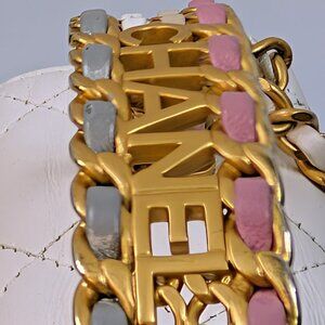This rare and highly sought-after Chanel 19 Flap Bag is presented in a white lambskin leather, featuring the distinctive oversized diamond quilting that is characteristic of the 19 product line. Its unique charm comes from the mixed-metal hardware, which includes gold-tone, ruthenium-tone, and antique silver-tone finishes on the chain-link strap, interwoven with white leather and accented with colorful segments of pink, white, and grey. This strap allows for shoulder or cross-body carry. The corners have been retouched by leather specialists. The front flap is adorned with the signature oversized, interlocking CC turn-lock. A key feature of the bag is its structured top handle with matching mixed-metal and leather chain detail. The interior is spacious and lined with a soft grey leather, this bag is a luxurious yet versatile accessory for day or evening.