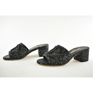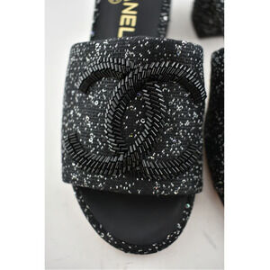 Chanel 19P Black White Fabric CC Logo Backless Slide Mule Sandal Block Heel 35