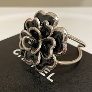 Gorgeous, classy, and one of a kind! From Chanel’s 2003 Cruise Collection, this silver Chanel cuff features a black enamel Camellia flower with a CC in the center and open backing for easy wear. This piece is extremely versatile and can be dressed up or down, making this versatile and so desirable! Excellent vintage condition, in the original Chanel box.