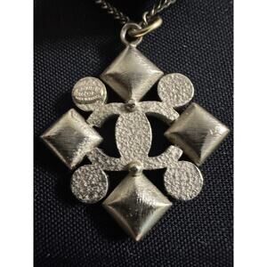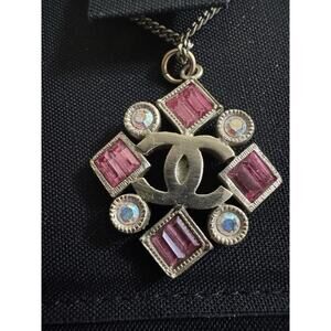 Elevate your collection with this stunning authentic Chanel necklace from the Spring 2005 collection. The design features a bold cross-inspired pendant centered with the iconic CC logo, accented with four pink baguette-cut crystals and four iridescent round stones. Crafted in an antique gold-tone finish, this necklace exudes timeless elegance and unmistakable Chanel style.