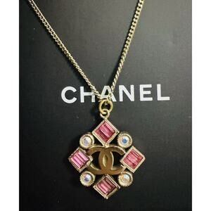 Chanel 2005P Crystal CC Logo Pendant Necklace Pink Stones Gold Tone