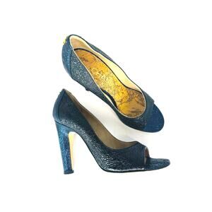 Chanel 2012 CC logo pump Metallic navy Blue Peeptoe Embossed Pumps heels EU 36