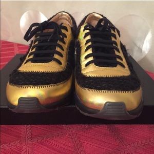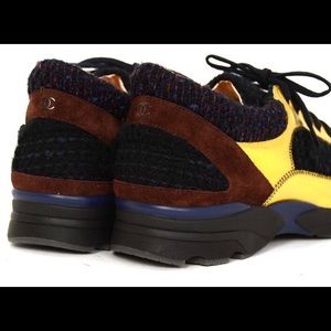Very recent Chanel low-top sneaker tennis shoes. Has gold iridescent leather with tweed wool material, suede inserts and rubber soles. European size is 40, fits like 9-9.5. Will come with a dust bag and box(lid has a small tear) The sneakers are new, I only wore them once indoors,unfortunately too big for me. My loss is your gain!