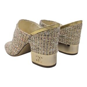 Chanel, mules, clogs, slides, tweed, metallic, gold, pink, cream, block heel, open toe, slingbacks, pre-owned, authenticity guaranteed, women's shoes, designer.