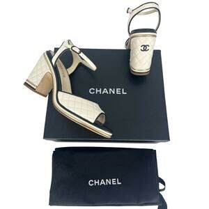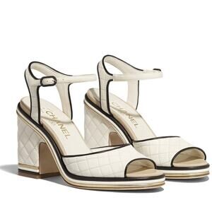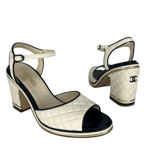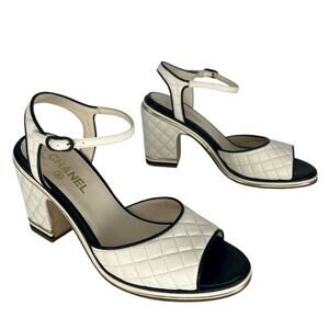 Step out in timeless elegance with these Chanel quilted lambskin block heel sandals. Crafted in Italy, these luxury heels feature quilted leather uppers with signature Interlocking CC logo hardware, black-tone buckle closure, and ankle straps for a secure fit. The block heel design offers both sophistication and stability, while the versatile white color ensures easy styling with dresses, trousers, or skirts. Perfect for weddings, evening events, or elevating chic daywear. A rare find in larger size 41.5, complete with original box and dust bags.