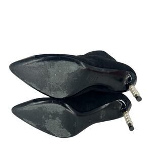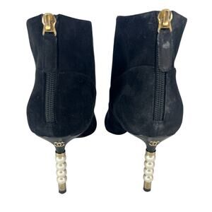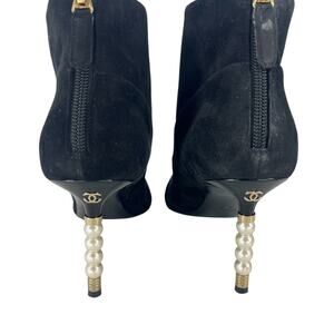 Chanel suede ankle boots from the Cruise 2020 Collection under Virginie Viard, featuring elegant faux pearl accents at the heels with interlocking CC logo detail. Designed with a sleek black suede exterior, pointed patent leather cap toes, side zip closures, and a refined silhouette that blends edgy design with signature Chanel femininity. A collectible and highly coveted Chanel style that elevates both casual and polished looks.