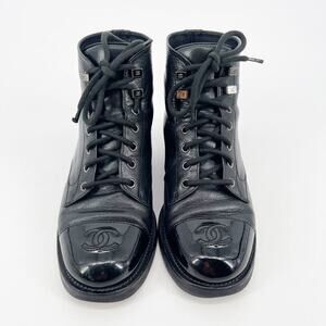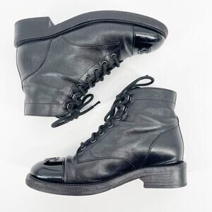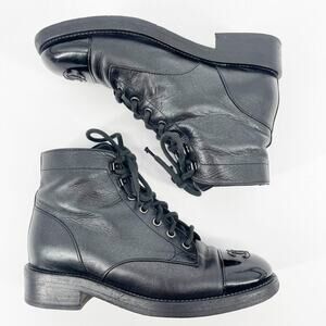 Chanel 2020 Interlocking CC Logo Black Glitter Patent Cap Toe Combat Boot EU 37