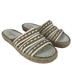 Chanel 2020 White Lambskin Chain Espadrille Slip-On Sandals Size 40