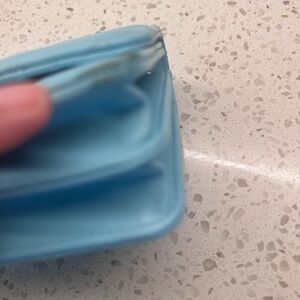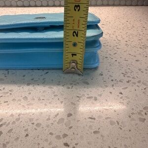 This is a stunning beauty.  I don't know actual color name but I call this Tiffany blue.  Used one time so overall excellent condition with exception of one corner which is scuffed.  I have tried to clean it but I am sure there is an easy fix.  See measurements w the ruler in the photos.  I expect this to go fast so don't hesitate.