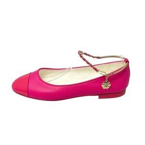Description: Traditional meets edgy with these classic 2022 Chanel Hot Pink Calfskin Leather and Patent Leather Cap-Toe Ballet Flats featuring a woven leather ankle chain and dangling camellia and CC charm. These shoes sold out everywhere!