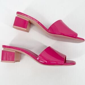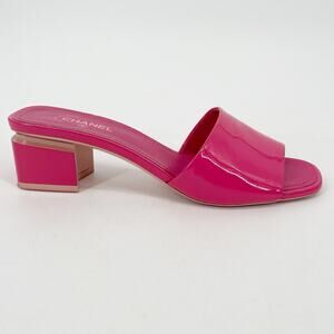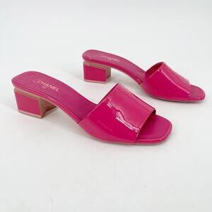 Chanel 2022 Pink Patent Calfskin CC Logo Low Block Heel Mules Sandals EU 38.5