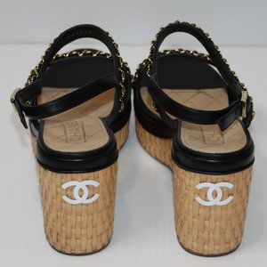 Chanel 20C Black Leather CC Chain Wicker Platform Wedge Sandal EU 40.5 / US 10.5