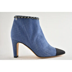 Chanel 20C Blue Denim Fabric Black Chain CC Logo Short Ankle Heel Bootie 38