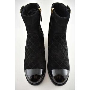 Chanel 20K Black Suede Quilted Turnlock CC Gold Patent Ankle Short Zip Boots 36.5