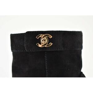 Chanel 20K Black Suede Quilted Turnlock CC Gold Patent Ankle Short Zip Boots 35