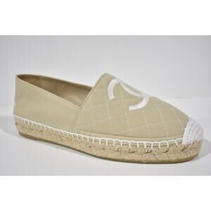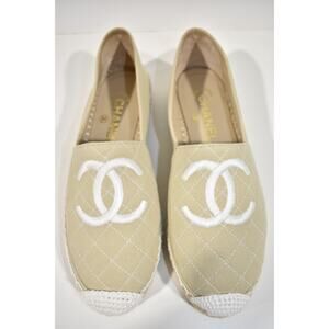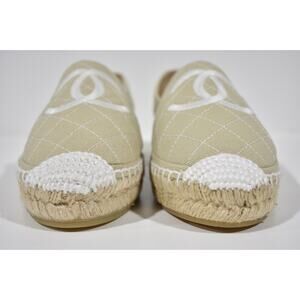 Chanel 20P Beige Canvas White Quilted CC Logo Classic Ballet Espadrille Flat 37