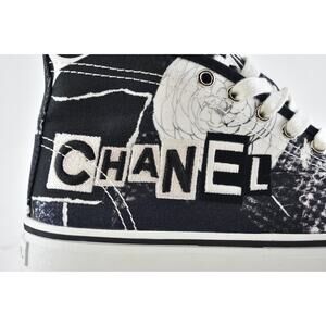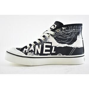 Chanel 20P Black White Fabric CC Logo Flat High Top Runner Trainer Sneaker 37