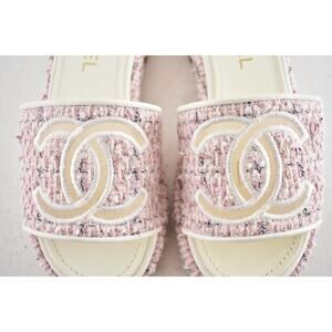 Chanel 20P Pink White Tweed Mesh CC Logo Slide Slip On Sandal Mule Heel Flat 36
