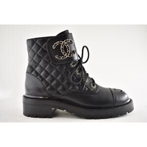 Chanel 21A Black Quilted Gold CC Chain Combat Lace Up Tie Ankle Short Boots 35