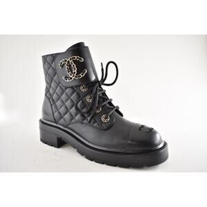 Chanel 21A Black Quilted Gold CC Chain Combat Lace Up Tie Ankle Short Boots 39