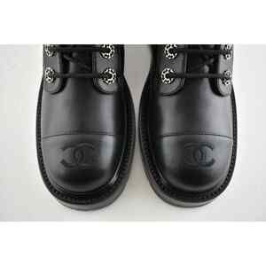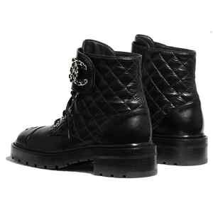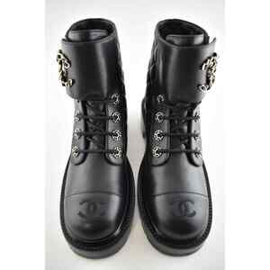 Chanel 21A Black Quilted Gold CC Chain Combat Lace Up Tie Ankle Short Boots 41