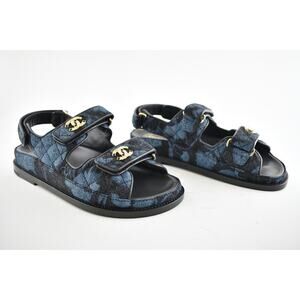 Chanel 21A Blue Black Grey Denim CC Logo Mule Slide Strap Flat Dad Sandal 36.5