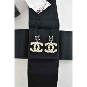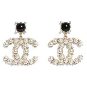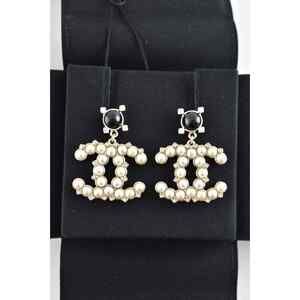 Chanel 21A Gold Black Crystal Pearl CC Logo Large Dangle Drop Statement Earrings