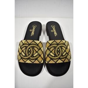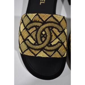 Chanel 21A Gold Black Pearl Embroidery Bead CC Logo Slide Sandal Mule Flat 36