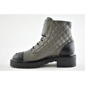 Chanel 21A Grey Black Quilted CC Chain Combat Lace Up Tie Ankle Short Boots 36