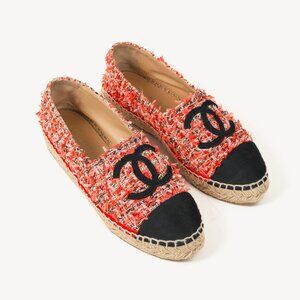 These espadrilles from Chanel's 2021 Cruise collection are crafted in a Coral tweed with tinges of Red and Pink throughout, and are accented with a Black grosgrain on the cap toes and the interlocking CC logos. They feature a low top, a flat slope, closed rounded toes, jupe on the midsole with red leather trim and whipstitching, leather lining and insoles, and diamond-texture rubber outsoles.