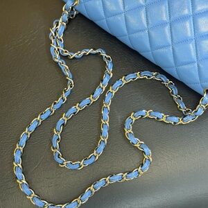 This beautiful caviar quilted Chanel bag in unique 21p blue color made of natural leather with golden color hardware. Bag in very nice condition, clean inside and outside, only has some small scratches on corners and metal details and small creases in the leather are visible on the front side of the bag. Size of the bag: length 12 x height 8 x width 3 inches. Bag comes with Chanel original tag and certificate of authenticity from Entrupy. What you see is what you get. This unique bag will be a great addition to your collection and will highlight the sophistication of your style. The best choice for you!