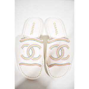 Name: Mules Color: White Style: 21P Style#: G37235 X01000 10601 Material: Lambskin Open front toe CC pink, yellow, blue multicolor stitched logo White lambskin leather material