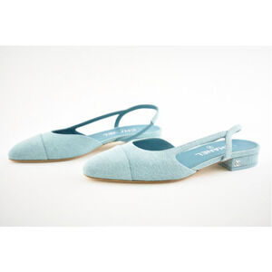 Size: 36.5 (know your Chanel size) Name: Coco Sling Color: Blue Style: Slingback Flat Season: 21S Style#: G31319 X56190 0K810 Material: Denim Cap toe front toe CC side logo on heel Neon blue denim fabric material Slingback strap Stacked flat short back heel Brand new in box, comes with box and dust bag