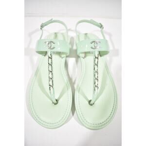 Chanel 22C Green Patent Silver Chain CC Logo Mule Slide Flat Thong Sandal 37