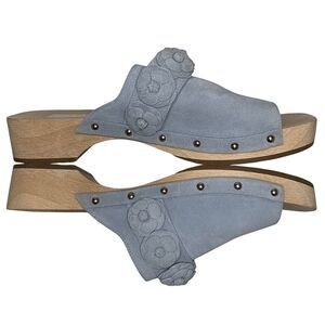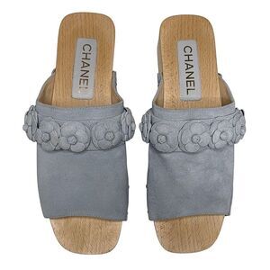 Chanel 22P CC Studded Camellia Clog Sandal Light Blue Suede EU 40 US 9-9.5 Mules