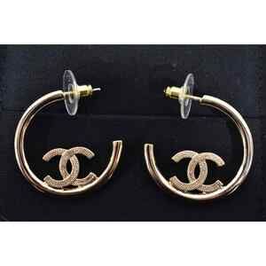 Chanel 22P Gold Metal Interlocking CC Logo Dangle Drop Statement Hoop Earrings