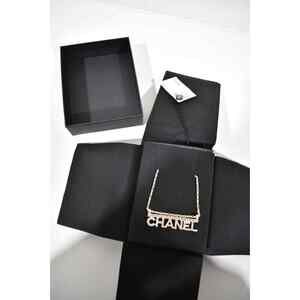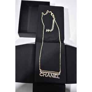 Chanel 22S Gold Crystal Bar Chain Link Name Plate CC Logo Drop Long Necklace