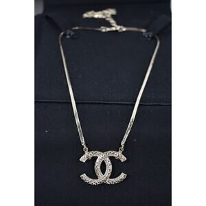 Chanel 22S Gold Metal Quilted Crystal Chain Link CC Logo Pendant Choker Necklace